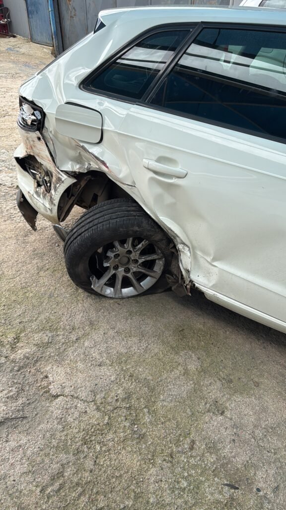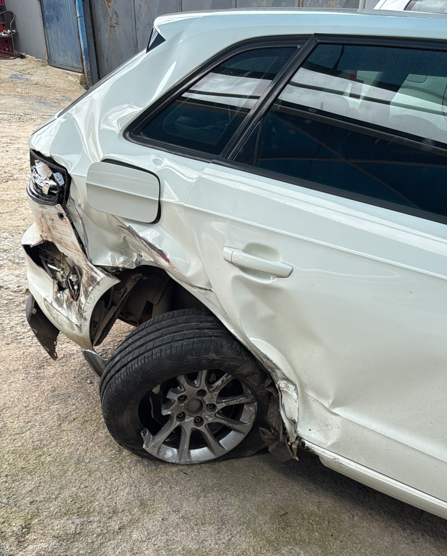 When this Audi arrived at our workshop, the damage was severe. The rear quarter panel was crushed, the bumper torn open, the taillight shattered, and the rear suspension visibly compromised. It wasn’t just cosmetic damage — the structural integrity of the rear section was affected.
